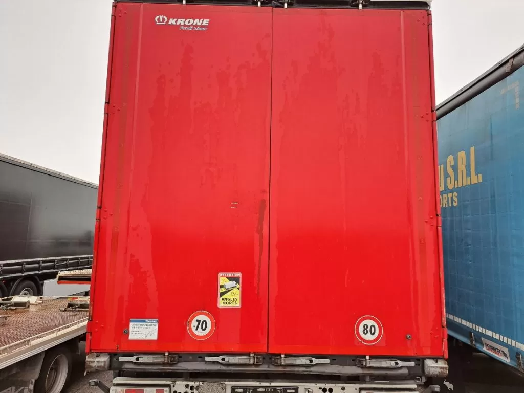 Semirimorchio Krone, 33 europalletts, 1° assale con sollevatore, centinatura con copri/scopri, porte posteriori, teli e piantoni scorrevoli, gommatura 385/65